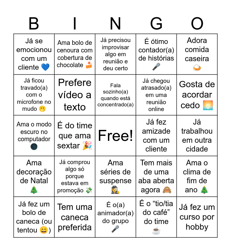 This bingo card has a free space and 100 words: Tem um pet 🐶🐱, Ama café ☕, Já trabalhou em outra cidade, Não começa o dia sem ouvir música 🎧, Prefere frio a calor ❄️, Já mandou mensagem no grupo errado 😅, Adora comida japonesa 🍣, Já fez uma reunião de pijama (e ninguém percebeu), É do time que fala “bom dia” em todas as reuniões 🌞, Ama viajar ✈️, Faz listas pra tudo ✏️, Já esqueceu o microfone aberto 😬, Ama assistir séries 📺, Tem uma caneca preferida, Adora memes e manda muitos no chat 😂, Tem filhos 👶, Já chegou atrasado(a) em uma reunião online, Prefere trabalhar à tarde, Já trabalhou com música de fundo, Ama doce 🍫, É fã de filmes da Disney/Pixar 🏰, Já mudou o fundo do Meet/Zoom pra algo engraçado, Tem mania de revisar o e-mail mil vezes antes de enviar ✉️, Usa emojis em quase todas as mensagens 😄, É competitivo(a) até em dinâmicas 💪, Já fez amizade com um cliente, Adora comida caseira 🍛, Tem mais de uma aba aberta agora 🙈, Já esqueceu o que ia falar na reunião, Tem uma planta em casa 🌿, É do time que ama sextar 🎉, Já se emocionou com um cliente 💙, Gosta de cozinhar 👩🍳, Fica com a câmera desligada quando o cabelo não ajuda 😅, É o “tio/tia do café” do time ☕, Fala sozinho(a) quando está concentrado(a), Ama o clima de fim de ano 🎄, Já fez um bolo ou doce que deu errado 🍰, Fala “rs” ou “kkk” o tempo todo, Adora ficar em casa 🏡, Já chorou de rir em reunião, Já confundiu o nome de alguém no chat, Ama o modo escuro no computador 🌑, Já trabalhou em coworking ou café ☕💻, Gosta de acordar cedo 🌅, Já precisou improvisar algo em reunião e deu certo, Ama praia 🏖️, Já tirou print de algo engraçado do time, Tem toque de organização com arquivos ou planilhas, É o(a) animador(a) do grupo 🎤, Já mandou um áudio de mais de 2 minutos 😅, Ama aprender coisas novas 📚, Já trabalhou com o som do ventilador no fundo, Tem uma playlist de foco 🎶, Já esqueceu de almoçar trabalhando 🍽️, Ama animais exóticos 🐢, Gosta de jogos de tabuleiro ou online 🎲, É fã de reality shows 📺, Prefere doce a salgado, É ótimo contador(a) de histórias 🎤, Já trabalhou com alguém que virou amigo pessoal 💬, Ama emojis de coração 💙, Já usou o chat pra contar fofoca leve do time 👀, Tem coleção de canecas ☕, Já se esqueceu de desativar o som das notificações no meio da reunião 🔔, Tem medo de insetos 🐜, Já riu de nervoso numa situação séria 😅, Ama uma boa planilha, Gosta de cantar no banho 🎤, Já mandou “boa noite” no lugar errado 🌙, Tem uma frase preferida de motivação ✨, Já comprou algo só porque estava em promoção 💸, Ama assistir vídeos de receitas (mesmo sem fazer depois), Já usou o modo “não perturbe” pra se concentrar, Gosta de assistir filmes antigos 🎞️, Já caiu na armadilha do “responder a todos” no e-mail 😬, Tem um toque criativo especial (pintar, desenhar, escrever, etc.) 🎨, Já ficou travado(a) com o microfone no mudo 🫢, Já mandou print errado no chat 😳, Ama uma boa fofoca de novela 📺, Tem medo de altura 😨, Já fez um curso por hobby, É do time dos que usam post-its por tudo 💛, Ama séries de suspense 🕵️♀️, Já usou um filtro engraçado sem querer em reunião, Ama bolo de cenoura com cobertura de chocolate 🍰, Prefere WhatsApp ao e-mail, Já ficou perdido(a) em uma planilha gigante 😅, Tem mania de corrigir erros de português (mentalmente ou não 😄), Ama decoração de Natal 🎄, Já teve problema com a internet no meio de reunião 💻, Fala rápido quando está animado(a), É o(a) “resolvedor(a)” do time 🧩, Já fez um bolo de caneca (ou tentou 😄), Prefere vídeo a texto, Já entrou em reunião errada 😬, Gosta de desafios e jogos de lógica 🧠, Já fez um meme interno sobre o time, É o(a) responsável por animar o grupo nos aniversários 🎉 and Está empolgado(a) pra essa dinâmica de bingo! 💙.