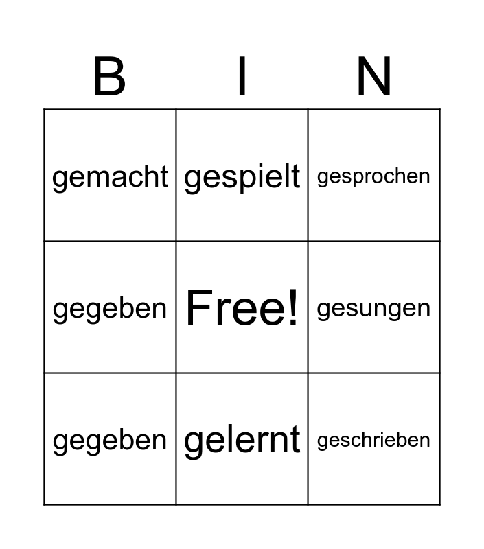 This bingo card has a free space and 25 words: gelesen, getroffen, gelernt, gefahren, geschrieben, gemacht, gesungen, gespielt, gegessen, gekauft, gesehen, getrunken, gegangen, gegeben, gegeben, gesehen, gefahren, gesprochen, gelesen, gespielt, gekauft, gegessen, gemacht, gegeben and gelaufen.