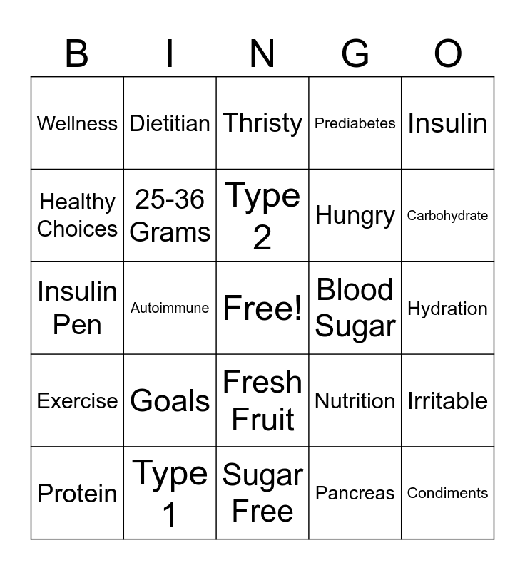This bingo card has a free space and 24 words: Goals, Type 1, Type 2, Protein, Insulin, Wellness, Healthy Choices, Dietitian, Blood Sugar, Fresh Fruit, Hungry, Insulin Pen, Nutrition, Irritable, 25-36 Grams, Pancreas, Hydration, Thristy, Carbohydrate, Autoimmune, Condiments, Exercise, Prediabetes and Sugar Free.
