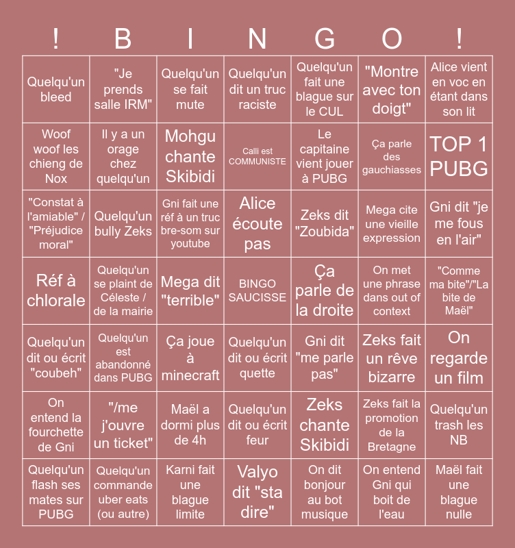 This bingo card has a free space and 48 words: Zeks chante Skibidi, Ça parle des gauchiasses, Valyo dit "sta dire", Quelqu'un se plaint de Céleste / de la mairie, Gni fait une réf à un truc bre-som sur youtube, "Comme ma bite"/"La bite de Maël", "Je prends salle IRM", Quelqu'un commande uber eats (ou autre), "Montre avec ton doigt", Quelqu'un dit ou écrit quette, Alice vient en voc en étant dans son lit, Quelqu'un dit un truc raciste, Mega cite une vieille expression, Zeks dit "Zoubida", On entend la fourchette de Gni, On met une phrase dans out of context, Woof woof les chieng de Nox, TOP 1 PUBG, Zeks fait la promotion de la Bretagne, Quelqu'un fait une blague sur le CUL, Le capitaine vient jouer à PUBG, Mega dit "terrible", Quelqu'un bleed, Il y a un orage chez quelqu'un, Quelqu'un trash les NB, Mohgu chante Skibidi, Gni dit "je me fous en l'air", Quelqu'un flash ses mates sur PUBG, Alice écoute pas, Quelqu'un bully Zeks, On entend Gni qui boit de l'eau, Ça parle de la droite, On regarde un film, "/me j'ouvre un ticket", Réf à chlorale, Gni dit "me parle pas", Zeks fait un rêve bizarre, "Constat à l'amiable" / "Préjudice moral", Ça joue à minecraft, Maël a dormi plus de 4h, Quelqu'un dit ou écrit "coubeh", Maël fait une blague nulle, Quelqu'un se fait mute, Karni fait une blague limite, Calli est COMMUNISTE, Quelqu'un dit ou écrit feur, Quelqu'un est abandonné dans PUBG and On dit bonjour au bot musique.