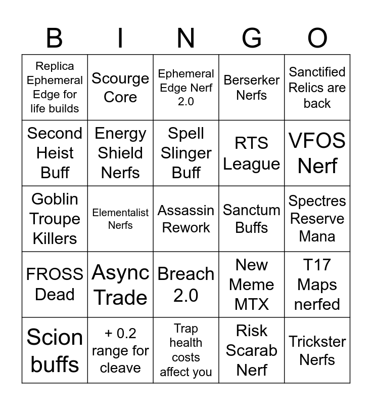 This bingo card has a free space and 24 words: Async Trade, + 0.2 range for cleave, Spell Slinger Buff, Scion buffs, Sanctified Relics are back, Replica Ephemeral Edge for life builds, Second Heist Buff, Scourge Core, Sanctum Buffs, Breach 2.0, RTS League, Goblin Troupe Killers, New Meme MTX, T17 Maps nerfed, Energy Shield Nerfs, Risk Scarab Nerf, Spectres Reserve Mana, Ephemeral Edge Nerf 2.0, VFOS Nerf, Elementalist Nerfs, Trickster Nerfs, FROSS Dead, Berserker Nerfs and Trap health costs affect you.