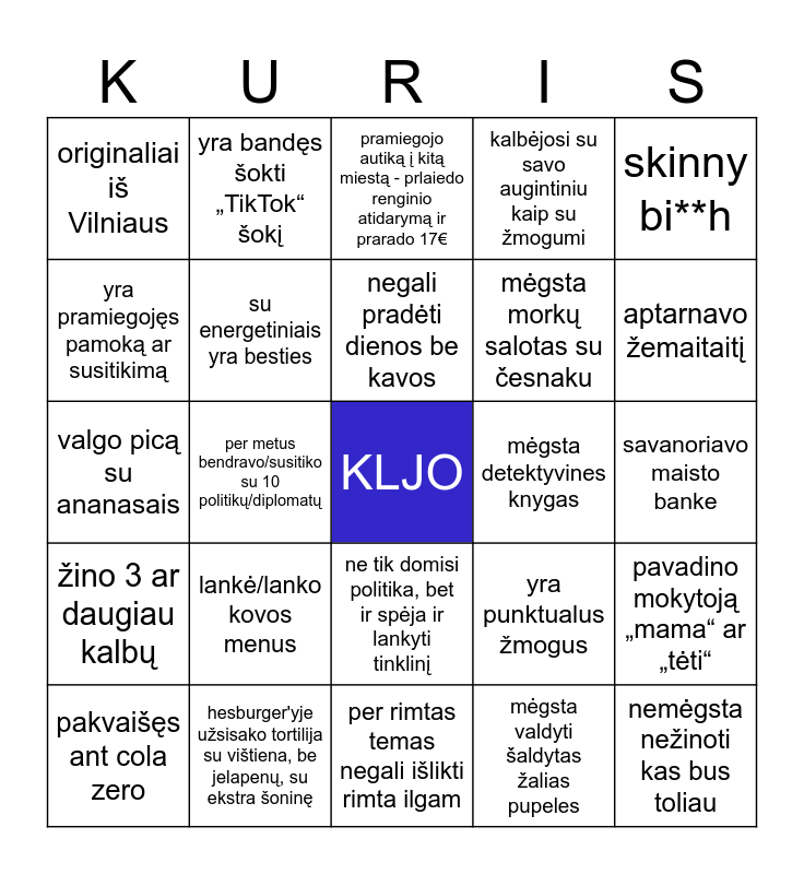 This bingo card has a free space and 29 words: pakvaišęs ant cola zero, alergiškas lašišai, per metus bendravo/susitiko su 10 politikų/diplomatų, turi gimnazijos metinį vidurkį - 9.5, originaliai iš Vilniaus, pramiegojo autiką į kitą miestą - prlaiedo renginio atidarymą ir prarado 17€, su energetiniais yra besties, lankė/lanko kovos menus, mėgsta detektyvines knygas, hesburger'yje užsisako tortilija su vištiena, be jelapenų, su ekstra šoninę, savanoriavo maisto banke, nemėgsta nežinoti kas bus toliau, per rimtas temas negali išlikti rimta ilgam, mėgsta valdyti šaldytas žalias pupeles, aptarnavo žemaitaitį, laisvalaikiu mėgsta tapyti, ne tik domisi politika, bet ir spėja ir lankyti tinklinį, žino 3 ar daugiau kalbų, skinny bi**h, valgo picą su ananasais, yra punktualus žmogus, turi daugiau nei 1000 nuotraukų telefone, mėgsta morkų salotas su česnaku, yra pramiegojęs pamoką ar susitikimą, kalbėjosi su savo augintiniu kaip su žmogumi, yra bandęs šokti „TikTok“ šokį, pavadino mokytoją „mama“ ar „tėti“, negali pradėti dienos be kavos and yra nusiuntęs žinutę neteisingam žmogui.