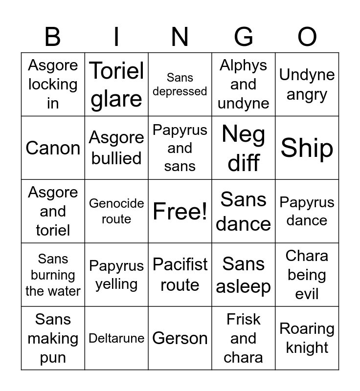 This bingo card has a free space and 24 words: Sans making pun, Papyrus yelling, Papyrus and sans, Frisk and chara, Undyne angry, Asgore locking in, Toriel glare, Sans depressed, Sans dance, Papyrus dance, Asgore and toriel, Asgore bullied, Sans asleep, Chara being evil, Canon, Deltarune, Gerson, Alphys and undyne, Ship, Sans burning the water, Genocide route, Pacifist route, Neg diff and Roaring knight.