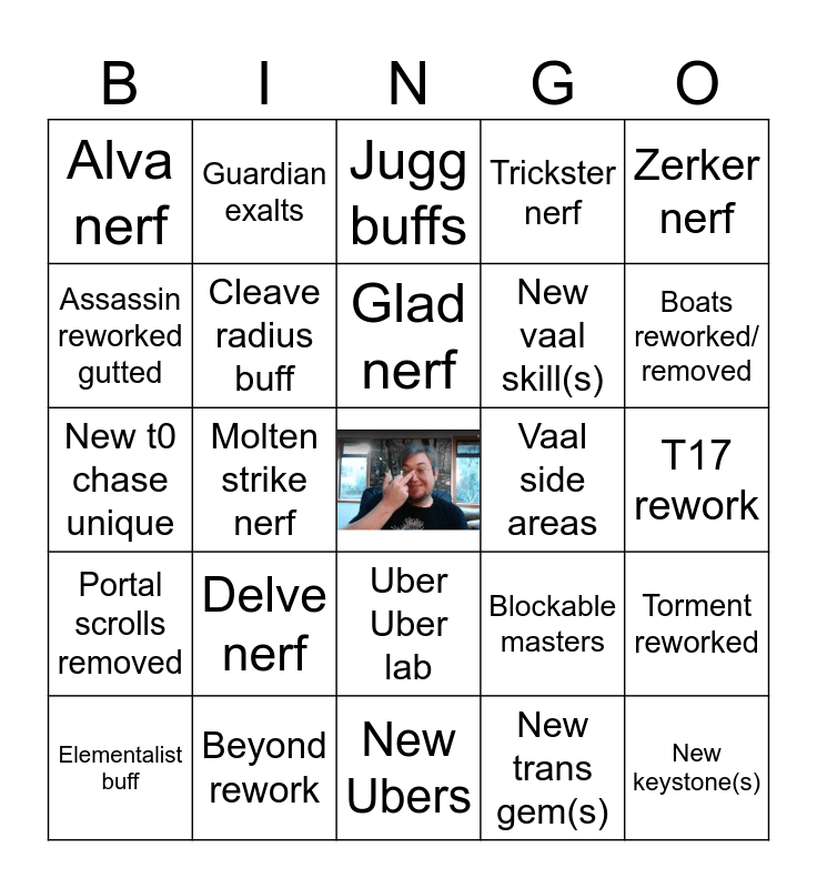 This bingo card has a free space and 24 words: Delve nerf, Beyond rework, Glad nerf, Elementalist buff, Zerker nerf, Alva nerf, Assassin reworked gutted, Guardian exalts, Vaal side areas, Uber Uber lab, New vaal skill(s), New t0 chase unique, Blockable masters, Torment reworked, Cleave radius buff, New trans gem(s), T17 rework, Jugg buffs, Boats reworked/ removed, Molten strike nerf, New keystone(s), Portal scrolls removed, Trickster nerf and New Ubers.