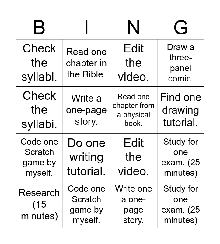 ⚠ This card has duplicate items: Work on one piece of homework. (25 minutes) (2), Study for one exam. (25 minutes) (2), Clean the room. (15 minutes) (2), Check the syllabi. (2), Edit the video. (3), Read one chapter from a physical book. (2), Read one chapter in the Bible. (2), Code one Scratch game by myself. (2)