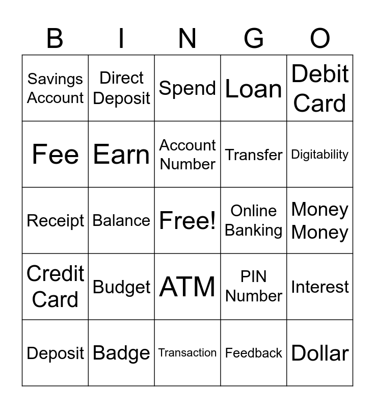 This bingo card has a free space and 29 words: Deposit, Withdraw, Balance, Checking Account, Savings Account, Spend, Earn, Budget, Online Banking, Badge, Money Money, Dollar, Transaction, Feedback, Digitability, Bankability, ATM, Credit Card, Debit Card, Receipt, PIN Number, Statement, Transfer, Fee, Loan, Direct Deposit, Interest, Account Number and Teller.