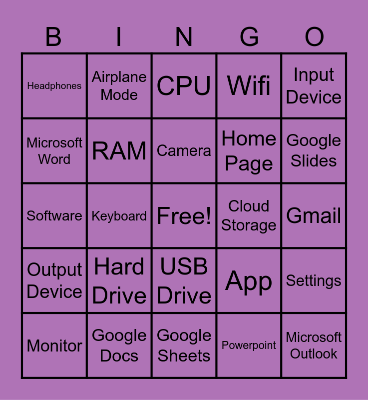 This bingo card has a free space and 29 words: Monitor, Mouse, Keyboard, Speakers, Headphones, CPU, RAM, Hard Drive, Cloud Storage, Google Docs, Gmail, Microsoft Outlook, Google Sheets, Powerpoint, Google Slides, Web Browser, USB Drive, Output Device, Input Device, Software, App, Dock, Home Page, Microsoft Word, Wifi, Airplane Mode, Settings, Camera and Clock.