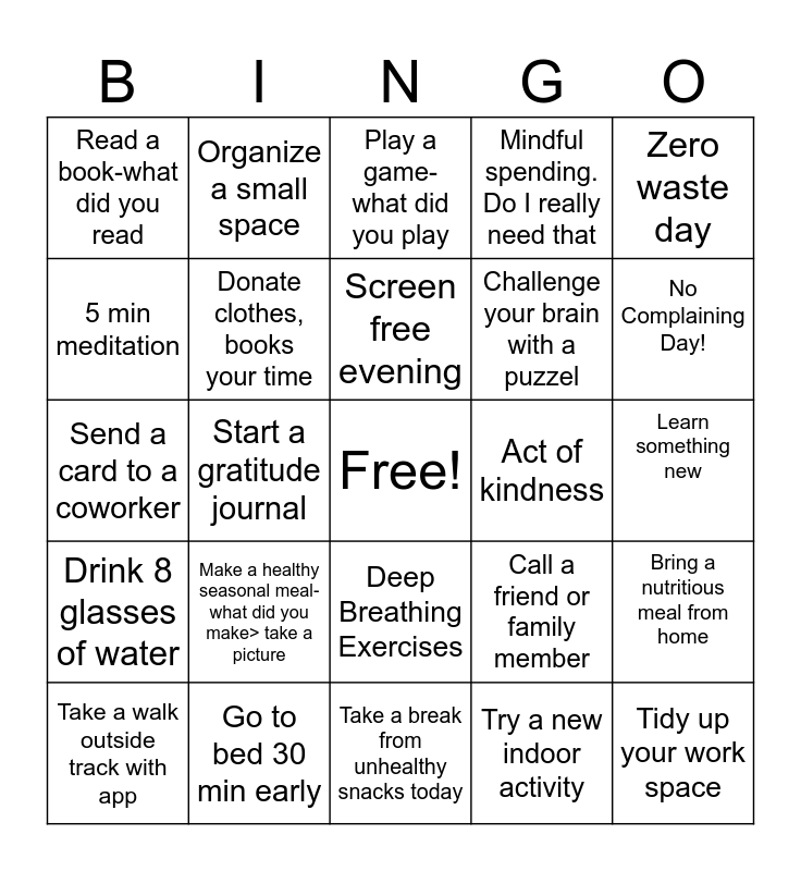 This bingo card has a free space and 24 words: Take a walk outside track with app, Make a healthy seasonal meal-what did you make> take a picture, Screen free evening, Try a new indoor activity, Zero waste day, Read a book-what did you read, Organize a small space, Play a game-what did you play, Act of kindness, Learn something new, Send a card to a coworker, Donate clothes, books your time, Call a friend or family member, Bring a nutritious meal from home, 5 min meditation, Go to bed 30 min early, Take a break from unhealthy snacks today, Mindful spending. Do I really need that, No Complaining Day!, Drink 8 glasses of water, Start a gratitude journal, Deep Breathing Exercises, Challenge your brain with a puzzel and Tidy up your work space.