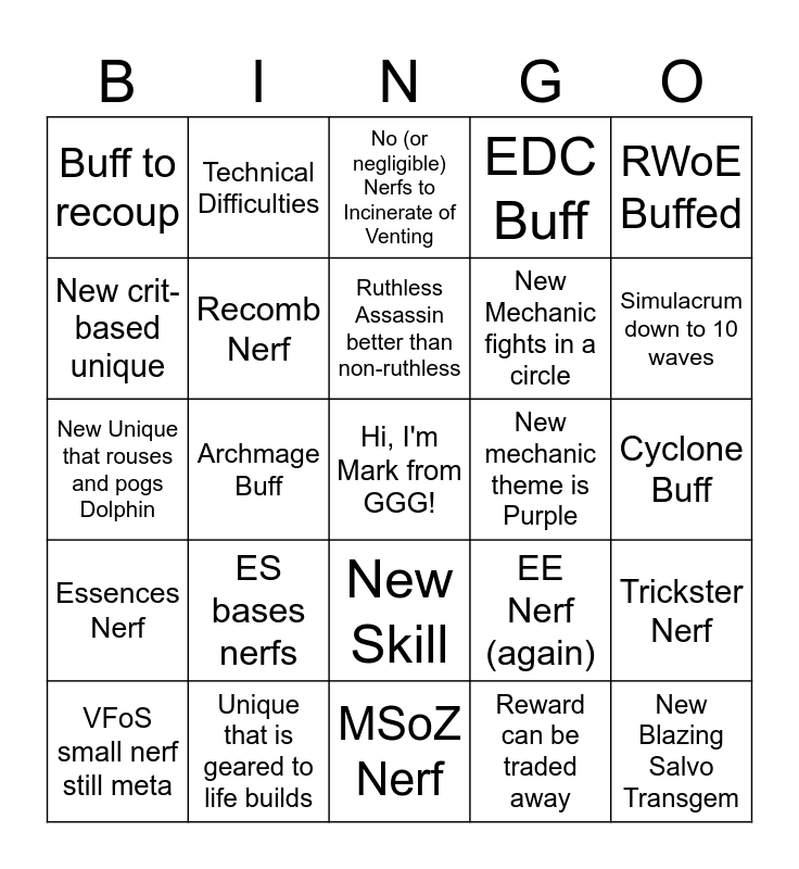 This bingo card has a free space and 24 words: ES bases nerfs, Unique that is geared to life builds, Ruthless Assassin better than non-ruthless, VFoS small nerf still meta, RWoE Buffed, Buff to recoup, New crit-based unique, Technical Difficulties, New mechanic theme is Purple, New Skill, New Mechanic fights in a circle, New Unique that rouses and pogs Dolphin, EE Nerf (again), Trickster Nerf, Recomb Nerf, Reward can be traded away, Cyclone Buff, No (or negligible) Nerfs to Incinerate of Venting, Simulacrum down to 10 waves, Archmage Buff, New Blazing Salvo Transgem, Essences Nerf, EDC Buff and MSoZ Nerf.