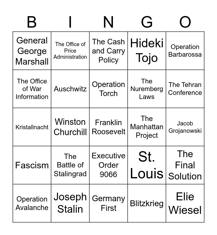 This bingo card has 25 words: The Battle of Stalingrad, Germany First, Operation Torch, Operation Avalanche, Operation Barbarossa, General George Marshall, The Office of War Information, The Office of Price Administration, The Manhattan Project, Executive Order 9066, The Nuremberg Laws, Kristallnacht, St. Louis, The Final Solution, Auschwitz, Elie Wiesel, Jacob Grojanowski, The Cash and Carry Policy, The Tehran Conference, Winston Churchill, Franklin Roosevelt, Joseph Stalin, Fascism, Hideki Tojo and Blitzkrieg.