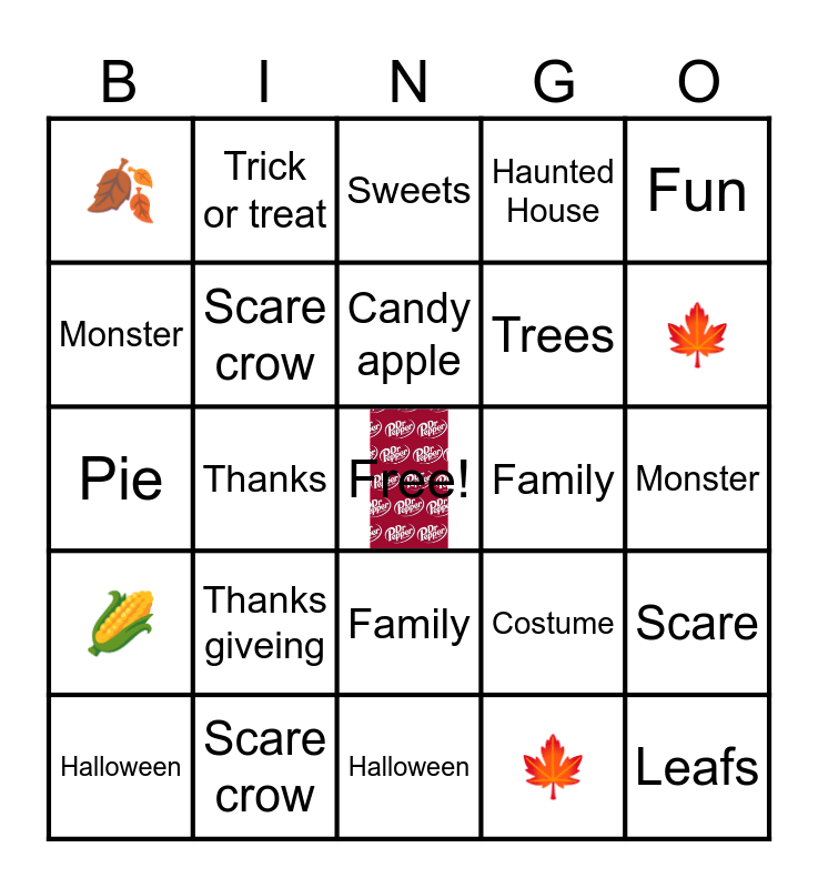 This bingo card has a free space and 50 words: Fall, Leafs, Pie, Halloween, Thanks giveing, Pumpkin, Trick or treat, Bat, Monster, Corn, Scare crow, Haunted House, Scare, Costume, 🦃, Candy, Candy apple, Family, Sweets, Fun, Thanks, 🍁, 🍂, Trees, Fun, Thanks, 🍁, 🍂, Sweets, Family, Candy apple, Candy, 🦃, Trees, Scare crow, Haunted House, Scare, Costume, Corn, Monster, Bat, Trick or treat, Pumpkin, Thanks giveing, Halloween, Pie, Leafs, Fall, 🌽 and Come play the new fall bingo have fun.