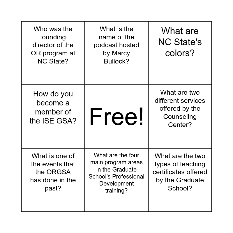 This bingo card has a free space and 11 words: What is the regular event that the ISE GSA hosts?, What are the four main program areas in the Graduate School's Professional Development training?, What are the two types of teaching certificates offered by the Graduate School?, What is one of the events that the ORGSA has done in the past?, What is the name of the podcast hosted by Marcy Bullock?, What are NC State's colors?, What are two different services offered by the Counseling Center?, Who is the president of the ORGSA?, How do you become a member of the ISE GSA?, Who was the founding director of the OR program at NC State? and What is the room number of the Graduate Student Lounge?.