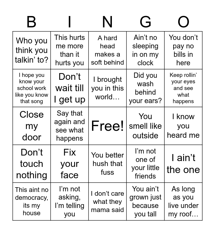 This bingo card has a free space and 34 words: What you do in the dark always comes to light, You ain’t grown just because you tall, Stop all the crying, You better act like you got some sense, Don’t touch nothing, Don’t wait till I get up, You don’t pay no bills in here, This aint no democracy, its my house, This hurts me more than it hurts you, Go sit down somewhere, I brought you in this world…, A hard head makes a soft behind, I’m not mad, just disappointed, I got eyes in the back of my head, You smell like outside, Keep rollin’ your eyes and see what happens, I’m not asking, I’m telling you, Close my door, Fix your face, I’m not one of your little friends, You better hush that fuss, I said what I said, Who you think you talkin’ to?, I know you heard me, I don’t care what they mama said, As long as you live under my roof…, Ain’t no sleeping in on my clock, Keep playing and see what happens, Did you wash behind your ears?, I hope you know your school work like you know that song, You better pray about it, Say that again and see what happens, I ain’t the one and You better fix your face before I fix it for you.