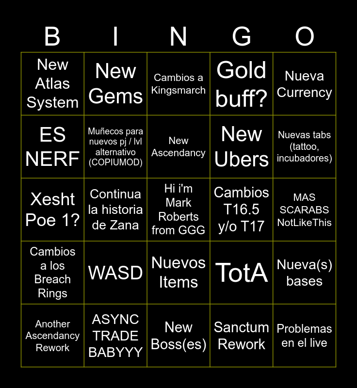 This bingo card has a free space and 24 words: WASD, ASYNC TRADE BABYYY, New Ascendancy, Another Ascendancy Rework, Nueva Currency, New Atlas System, ES NERF, New Gems, Cambios T16.5 y/o T17, Nuevos Items, New Ubers, Xesht Poe 1?, TotA, Nueva(s) bases, Muñecos para nuevos pj / lvl alternativo (COPIUMOD), Sanctum Rework, MAS SCARABS NotLikeThis, Cambios a Kingsmarch, Nuevas tabs (tattoo, incubadores), Continua la historia de Zana, Problemas en el live, Cambios a los Breach Rings, Gold buff? and New Boss(es).