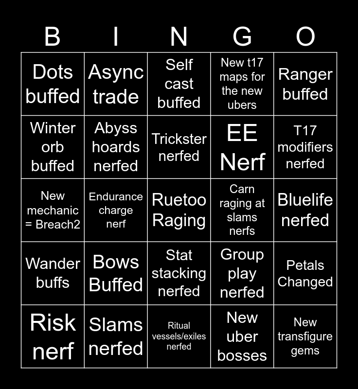 This bingo card has a free space and 24 words: Bows Buffed, Slams nerfed, Trickster nerfed, Risk nerf, Ranger buffed, Dots buffed, Winter orb buffed, Async trade, Carn raging at slams nerfs, Stat stacking nerfed, EE Nerf, New mechanic = Breach2, Group play nerfed, Petals Changed, Abyss hoards nerfed, New uber bosses, Bluelife nerfed, Self cast buffed, T17 modifiers nerfed, Endurance charge nerf, New transfigure gems, Wander buffs, New t17 maps for the new ubers and Ritual vessels/exiles nerfed.