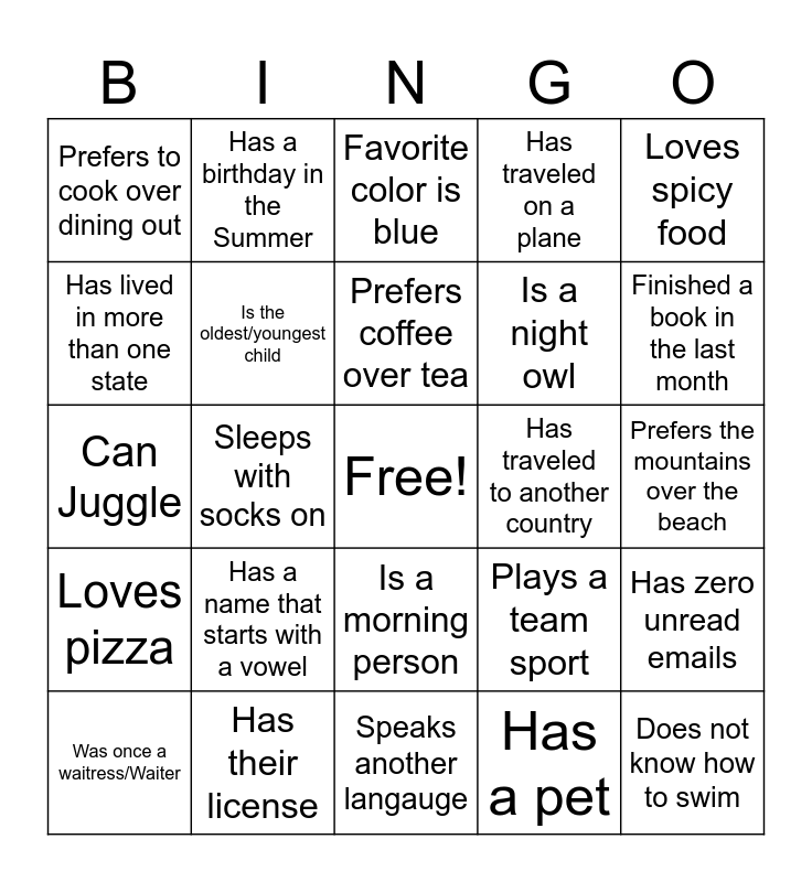 This bingo card has a free space and 24 words: Has a name that starts with a vowel, Has their license, Prefers coffee over tea, Was once a waitress/Waiter, Loves spicy food, Prefers to cook over dining out, Has lived in more than one state, Has a birthday in the Summer, Has traveled to another country, Is a morning person, Is a night owl, Can Juggle, Plays a team sport, Has zero unread emails, Is the oldest/youngest child, Has a pet, Prefers the mountains over the beach, Favorite color is blue, Finished a book in the last month, Sleeps with socks on, Does not know how to swim, Loves pizza, Has traveled on a plane and Speaks another langauge.