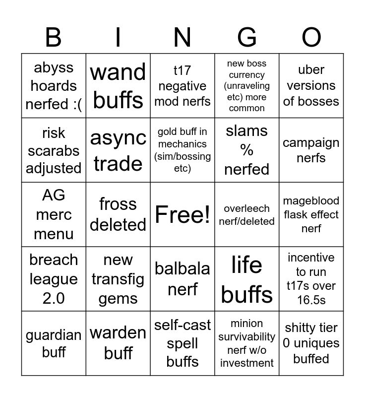 This bingo card has a free space and 24 words: new transfig gems, warden buff, gold buff in mechanics (sim/bossing etc), guardian buff, uber versions of bosses, abyss hoards nerfed :(, risk scarabs adjusted, wand buffs, overleech nerf/deleted, balbala nerf, slams % nerfed, AG merc menu, life buffs, incentive to run t17s over 16.5s, async trade, minion survivability nerf w/o investment, mageblood flask effect nerf, t17 negative mod nerfs, campaign nerfs, fross deleted, shitty tier 0 uniques buffed, breach league 2.0, new boss currency (unraveling etc) more common and self-cast spell buffs.