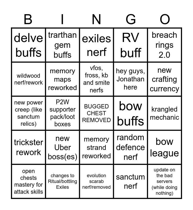 This bingo card has a free space and 24 words: new Uber boss(es), changes to Ritual/bottling Exiles, vfos, fross, kb and smite nerfs, open chests mastery for attack skills, breach rings 2.0, delve buffs, wildwood nerf/rework, trarthan gem buffs, bow buffs, memory strand reworked, hey guys, Jonathan here, new power creep (like sanctum relics), random defence nerf, bow league, memory maps reworked, sanctum nerf, krangled mechanic, exiles nerf, new crafting currency, P2W supporter pack/loot boxes, update on the bad servers (while doing nothing), trickster rework, RV buff and evolution scarab nerf/removed.