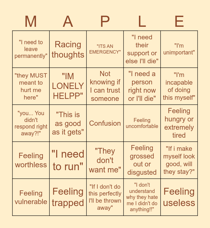 This bingo card has a free space and 24 words: "I need to run", Feeling trapped, Not knowing if I can trust someone, Feeling vulnerable, "I'm unimportant", "I need to leave permanently", "they MUST meant to hurt me here", Racing thoughts, Feeling uncomfortable, "They don't want me", "I need a person right now or I'll die", "you... You didn't respond right away?!", Feeling grossed out or disgusted, "If i make myself look good, will they stay?", "IM LONELY HELPP", "I don't understand why they hate me I didn't do anything!!", Feeling hungry or extremely tired, "ITS AN EMERGENCY", "I'm incapable of doing this myself", "This is as good as it gets", Feeling useless, Feeling worthless, "I need their support or else I'll die" and "If I don't do this perfectly I'll be thrown away".