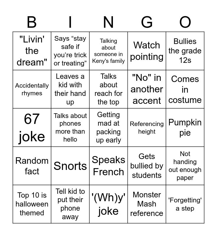 This bingo card has 41 words: Free!, 67 joke, Says he is evil, Leaves a kid with their hand up, Tell kid to put their phone away, Speaks French, Talks about reach for the top, '(E)x's joke, Bullies the grade 12s, Random fact, Talks about phones more than hello, Watch pointing, Getting mad at packing up early, Pumpkin pie, Referencing height, Snorts, "Y'all", "Livin' the dream", Obscure reference to something, Talking about someone in Keny's family, Not handing out enough paper, 'Forgetting' a step, '(Wh)y' joke, "No" in another accent, Tells us to do their work, Orange juice, Monster Mash reference, Ask for candy, Comes in costume, Says his post secondary school is better than western, Mentions students older sibling (not Keny's), Says “stay safe if you’re trick or treating”, Top 10 is halloween themed, Is mean to us, Gets bullied by students, Accidentally rhymes, References outdated meme, Dad joke, Says happy Halloween, In a goofy pose and Touches his hair.