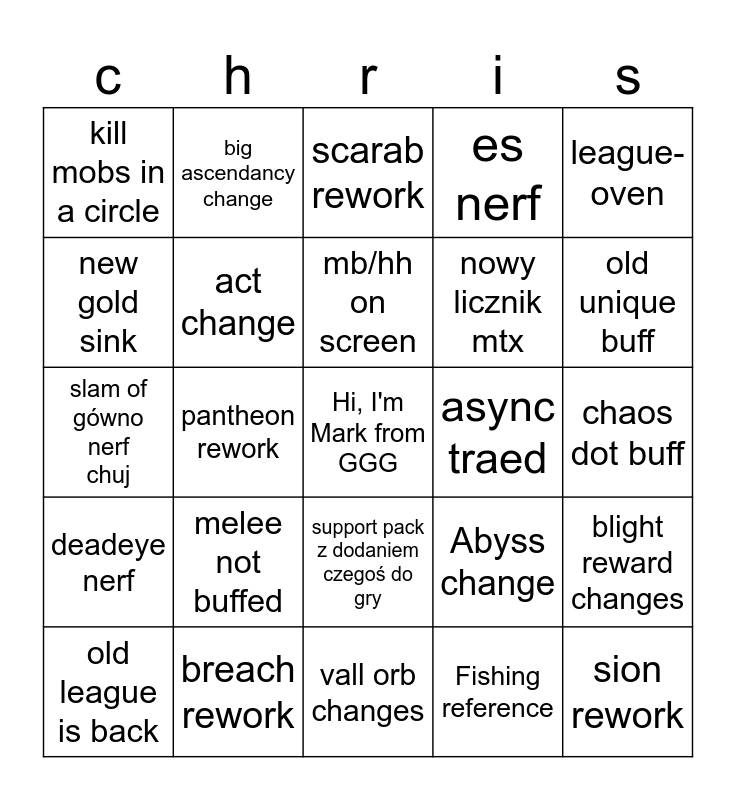 This bingo card has a free space and 24 words: melee not buffed, breach rework, mb/hh on screen, old league is back, league-oven, kill mobs in a circle, new gold sink, big ascendancy change, async traed, support pack z dodaniem czegoś do gry, nowy licznik mtx, slam of gówno nerf chuj, Abyss change, blight reward changes, act change, Fishing reference, chaos dot buff, scarab rework, old unique buff, pantheon rework, sion rework, deadeye nerf, es nerf and vall orb changes.