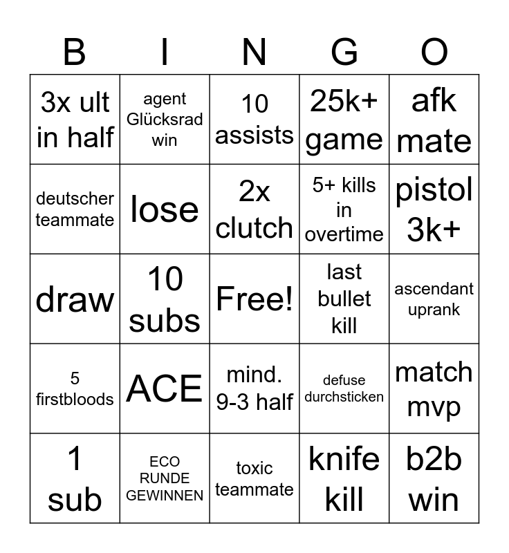 This bingo card has a free space and 24 words: ACE, ECO RUNDE GEWINNEN, 2x clutch, 1 sub, afk mate, 3x ult in half, deutscher teammate, agent Glücksrad win, last bullet kill, mind. 9-3 half, 5+ kills in overtime, draw, defuse durchsticken, match mvp, lose, knife kill, ascendant uprank, 10 assists, pistol 3k+, 10 subs, b2b win, 5 firstbloods, 25k+ game and toxic teammate.