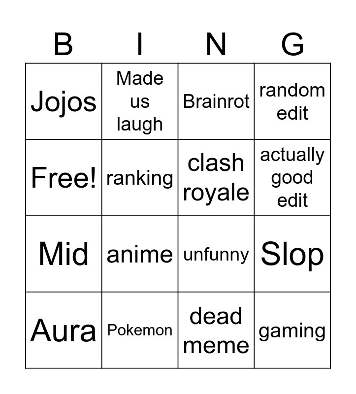 This bingo card has 16 words: Pokemon, Slop, Brainrot, Jojos, Mid, Made us laugh, unfunny, dead meme, Free!, ranking, Aura, random edit, anime, actually good edit, clash royale and gaming.