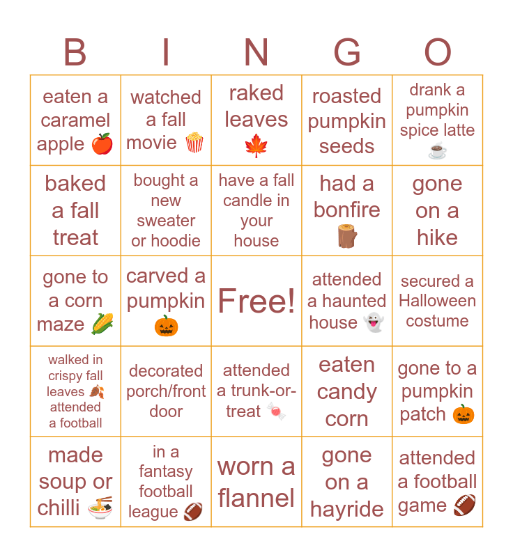 This bingo card has a free space and 24 words: decorated porch/front door, in a fantasy football league π, have a fall candle in your house, made soup or chilli π, drank a pumpkin spice latte βοΈ, eaten a caramel apple π, baked a fall treat, watched a fall movie πΏ, attended a haunted house π», attended a trunk-or- treat π¬, had a bonfire πͺ΅, gone to a corn maze π½, eaten candy corn, gone to a pumpkin patch π, bought a new sweater or hoodie, gone on a hayride, secured a Halloween costume, raked leaves π, gone on a hike, carved a pumpkinπ, attended a football game π, walked in crispy fall leaves π attended a football, roasted pumpkin seeds and worn a flannel.
