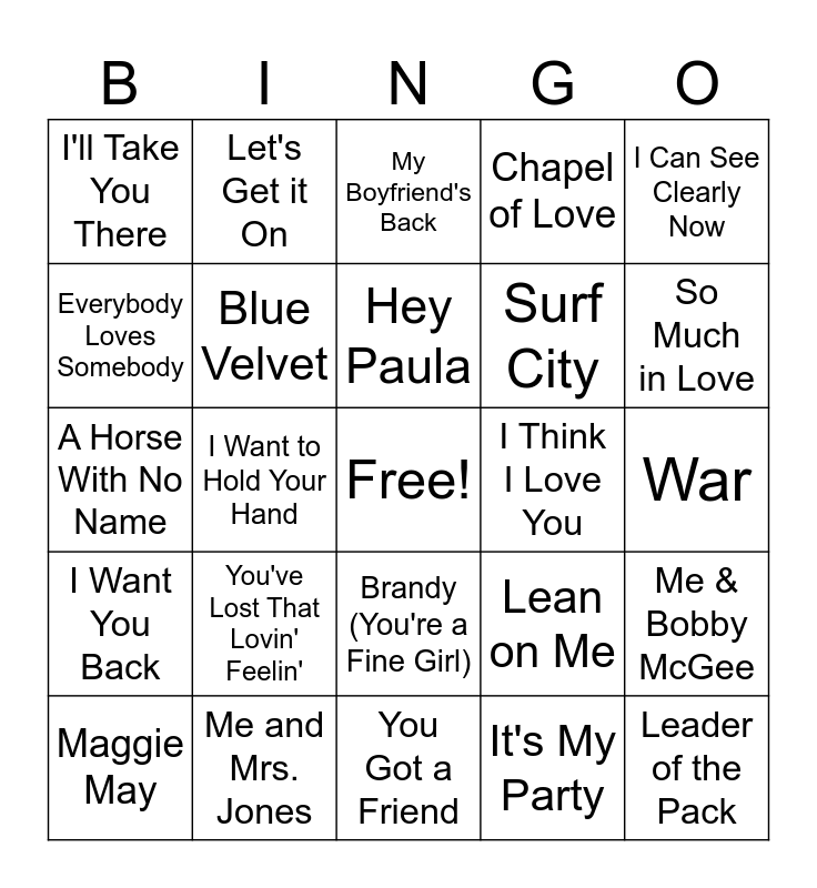 This bingo card has a free space and 35 words: Ain't No Mountain High Enough, Angie, Bad, Bad Leroy Brown, Blue Velvet, Brandy (You're a Fine Girl), Chapel of Love, Everybody Loves Somebody, Hang on Sloopy, Hey Paula, Hooked on a Feeling, A Horse With No Name, I Can See Clearly Now, I Can't Help Myself, I Get Around, I'll Take You There, I Think I Love You, It's My Party, I Want to Hold Your Hand, I Want You Back, Leader of the Pack, Lean on Me, Maggie May, Me & Bobby McGee, Me and Mrs. Jones, My Boyfriend's Back, So Much in Love, The Sound of Silence, Sugar Shack, Surf City, War, Where Did Our Love Go?, You Got a Friend, You've Lost That Lovin' Feelin', Let's Get it On and Let It Be.