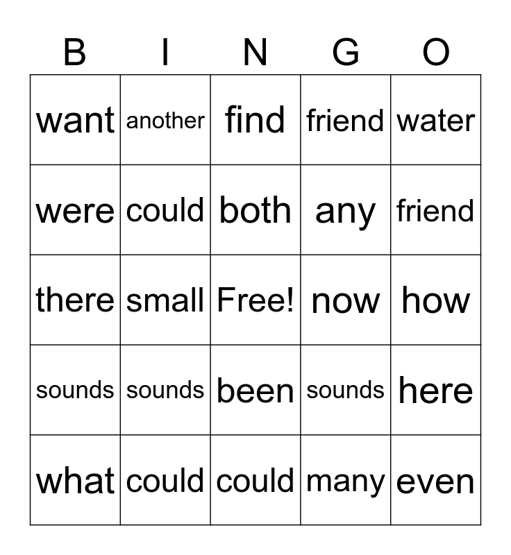 This bingo card has a free space and 24 words: sounds, could, both, what, water, want, were, another, now, been, any, there, sounds, here, could, many, how, find, friend, small, even, sounds, friend and could.