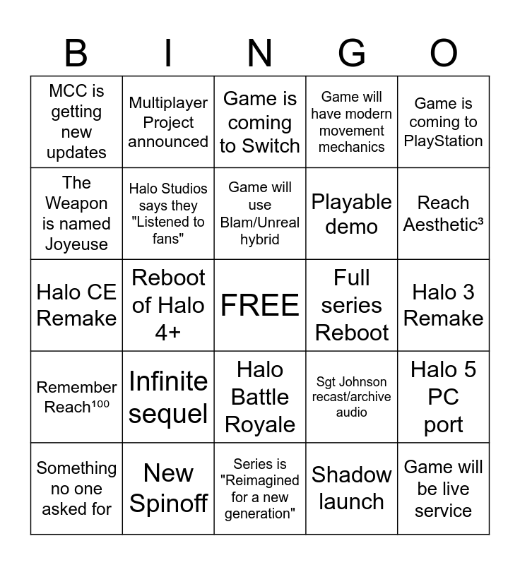This bingo card has a free space and 24 words: Infinite sequel, New Spinoff, Game will use Blam/Unreal hybrid, Something no one asked for, Game is coming to PlayStation, MCC is getting new updates, The Weapon is named Joyeuse, Multiplayer Project announced, Full series Reboot, Halo Battle Royale, Playable demo, Halo CE Remake, Sgt Johnson recast/archive audio, Halo 5 PC port, Halo Studios says they "Listened to fans", Shadow launch, Halo 3 Remake, Game is coming to Switch, Reach Aesthetic³, Reboot of Halo 4+, Game will be live service, Remember Reach¹⁰⁰, Game will have modern movement mechanics and Series is "Reimagined for a new generation".