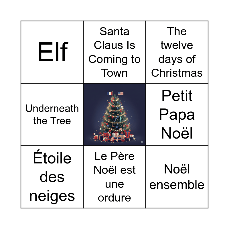 This bingo card has a free space and 30 words: All I Want for Christmas Is You, Blue Christmas, Douce nuit, sainte nuit, Driving Home for Christmas, Elf, The twelve days of Christmas, Étoile des neiges, Feliz Navidad, Happy Xmas, Have Yourself a Merry Little Christmas, It’s Beginning to Look a Lot Like Christmas, La fille du Père Noël, Last Christmas, Le petit renne au nez rouge, Let It Snow! Let It Snow! Let It Snow!, Mon beau sapin, Noël à Paris, Noël blanc, Noël des enfants du monde, Noël ensemble, Rockin’ Around the Christmas Tree, Rudolph the Red-Nosed Reindeer, Santa Claus Is Coming to Town, Tombe la neige, Petit Papa Noël, Underneath the Tree, Vive le vent, White Christmas, Le Père Noël est une ordure and Fa la la la.
