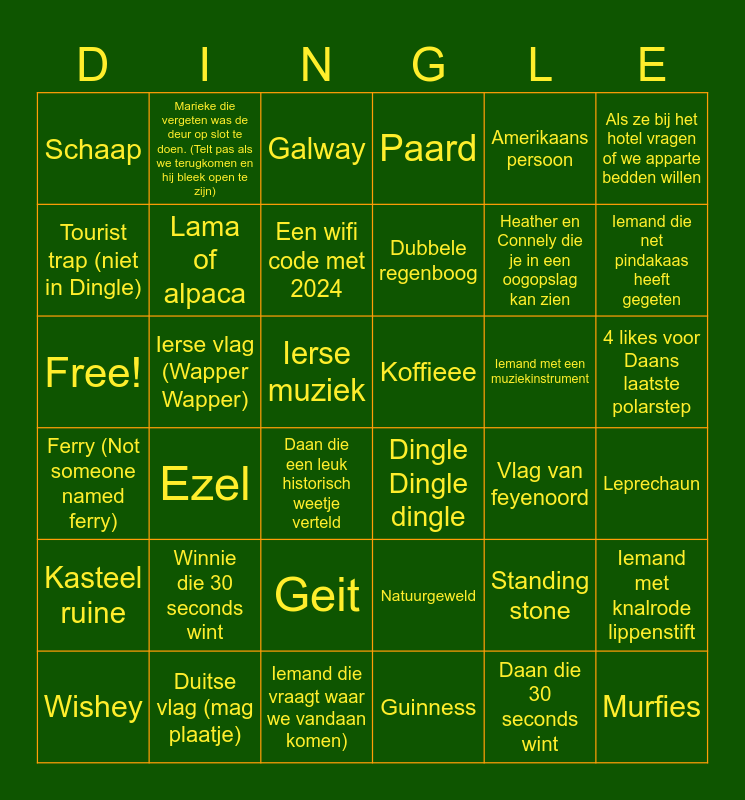 This bingo card has 36 words: Natuurgeweld, Geit, Guinness, Tourist trap (niet in Dingle), Ferry (Not someone named ferry), Koffieee, Lama of alpaca, Iemand die vraagt waar we vandaan komen), Amerikaans persoon, Standing stone, Iemand die net pindakaas heeft gegeten, Paard, Iemand met knalrode lippenstift, Ierse vlag (Wapper Wapper), Dubbele regenboog, Schaap, Kasteel ruine, Iemand met een muziekinstrument, Free!, Galway, Ierse muziek, Ezel, Dingle Dingle dingle, Daan die een leuk historisch weetje verteld, Vlag van feyenoord, Marieke die vergeten was de deur op slot te doen. (Telt pas als we terugkomen en hij bleek open te zijn), Heather en Connely die je in een oogopslag kan zien, Duitse vlag (mag plaatje), Een wifi code met 2024, Als ze bij het hotel vragen of we apparte bedden willen, Murfies, Wishey, Leprechaun, 4 likes voor Daans laatste polarstep, Winnie die 30 seconds wint and Daan die 30 seconds wint.