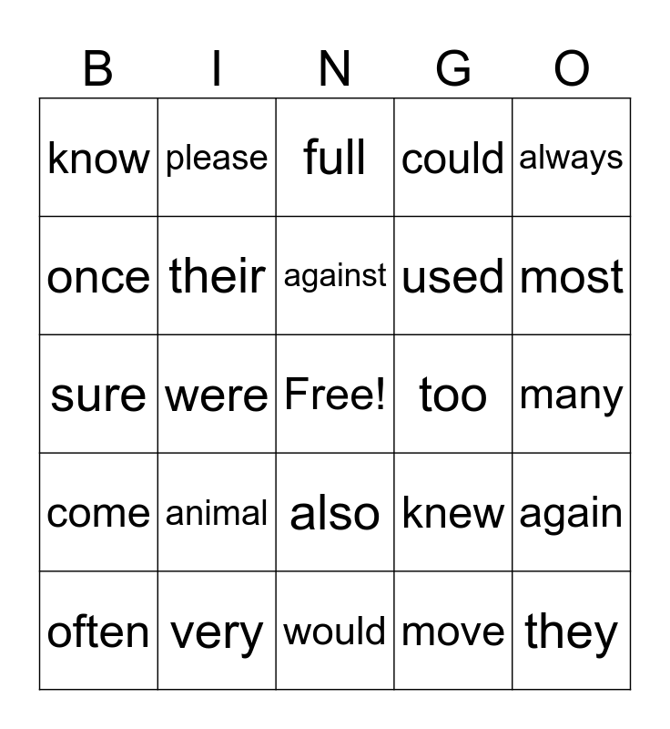 This bingo card has a free space and 24 words: animal, very, against, often, always, know, once, please, too, also, used, sure, knew, again, their, move, many, full, most, were, they, come, could and would.