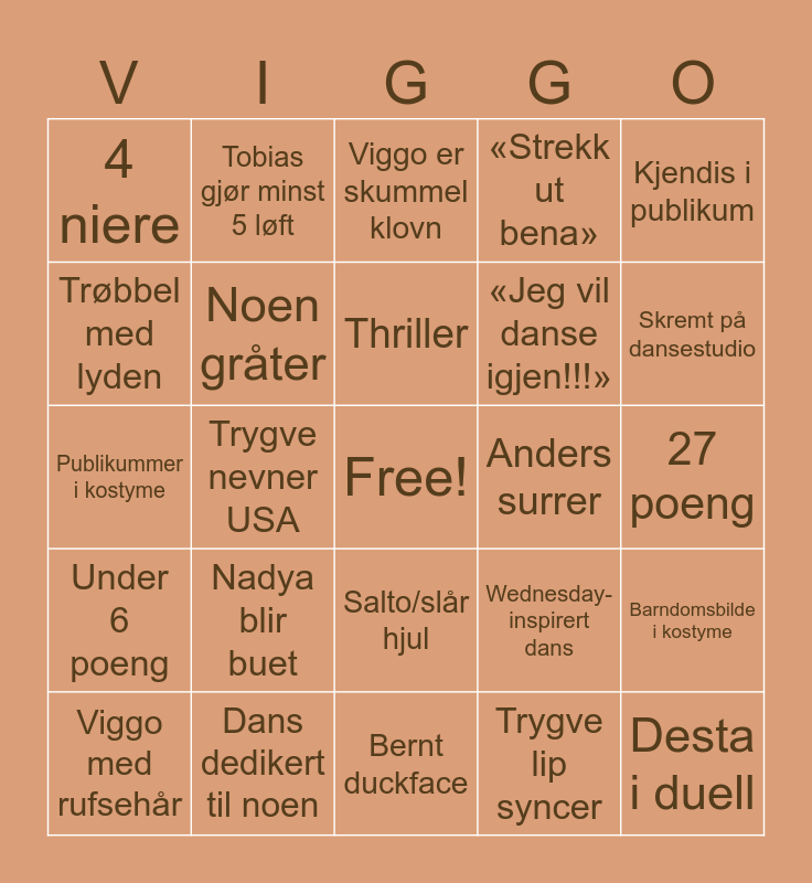 This bingo card has a free space and 34 words: Dommerne i matchende kostymer, Trygve lip syncer, 10 poeng, Murder on the dancefloor, Under 6 poeng, Noen gråter, Kjendis i publikum, Viggo med rufsehår, Tobias gjør minst 5 løft, Vampyr, Thriller, Viggo er skummel klovn, Halloweenintro, Noen feiler på et løft, Anders surrer, Skremt på dansestudio, Dans dedikert til noen, Publikummer i kostyme, Nadya blir buet, Wednesday-inspirert dans, Salto/slår hjul, Lady Gaga, 4 niere, 27 poeng, Bernt duckface, Desta i duell, «Strekk ut bena», Halloween-ordspill fra Anders, «Jeg vil danse igjen!!!», Trøbbel med lyden, Tale sier «jeg elsker halloween», Trygve nevner USA, Barndomsbilde i kostyme and Danby får høyest score.