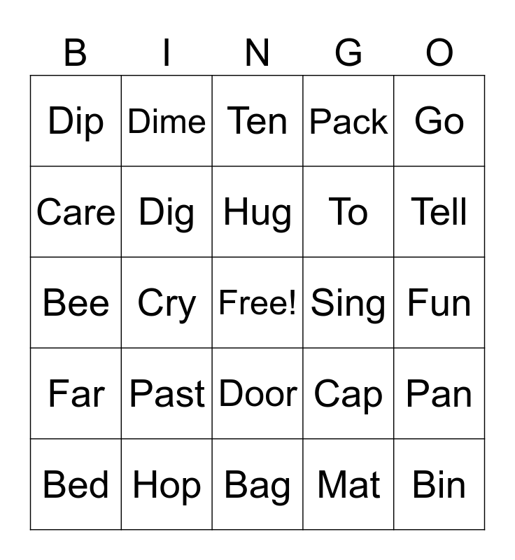 This bingo card has a free space and 24 words: Past, Hop, Hug, Bed, Go, Dip, Care, Dime, Sing, Door, To, Bee, Cap, Pan, Dig, Mat, Fun, Ten, Tell, Cry, Bin, Far, Pack and Bag.