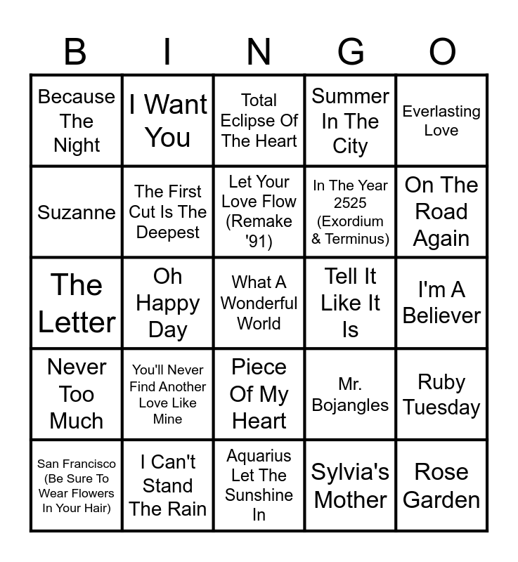 This bingo card has 72 words: Stand By Me, I Want You, Oh Happy Day, I Got You Babe, Blockbuster, Living Next Door To Alice, Summer In The City, Hang On Sloopy, In The Year 2525 (Exordium & Terminus), You Took The Words Right Out Of My Mouth, San Francisco (Be Sure To Wear Flowers In Your Hair), Mr. Tambourine Man, On The Road Again, Because The Night, Stand By Your Man, The Letter, Mr. Bojangles, Everlasting Love, Seasons In The Sun, I'm A Believer, You'll Never Find Another Love Like Mine, What A Wonderful World, Ruby Tuesday, Be My Baby, Black Is Black, Brown Eyed Girl, Only You, (Feels Like) Heaven, My Baby Just Cares For Me, The Most Beautiful Girl, I Can't Stand The Rain, Diana, Jumpin' Jack Flash, Whatever Will Be, Will Be (Que Sera, Sera), Sylvia's Mother, I'd Rather Go Blind, When A Man Loves A Woman, Confusion, Suzanne, Put Your Head On My Shoulder, Piece Of My Heart, Rose Garden, I Will Follow Him, The Lion Sleeps Tonight, Somebody To Love, Never Too Much, Turn! Turn! Turn! (To Everything There Is A Season), Africa, Heartbreaker, Mellow Yellow, Young Girl, Ring Of Fire, Rhythm Of The Rain, Tell It Like It Is, Knockin' On Heaven's Door, Eloise, Total Eclipse Of The Heart, Let Your Love Flow (Remake '91), Da Doo Ron Ron, Mandy, More Than A Feeling, Suspicious Minds, All The Young Dudes, Aquarius Let The Sunshine In, And When I Die, Love Me Tender, The First Cut Is The Deepest, Love The One You're With, American Woman, All Out Of Love, I Will Always Love You and Save The Last Dance For Me.