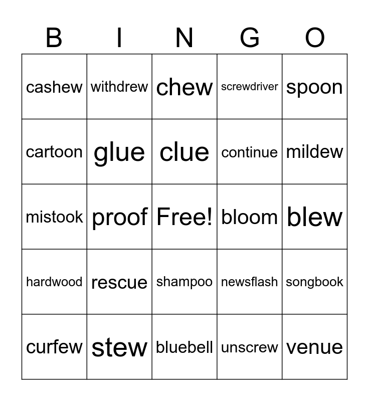 This bingo card has a free space and 39 words: mushroom, nephew, knew, glue, curfew, shampoo, clue, argue, spoon, hardwood, proof, screwdriver, venue, blew, bloom, rescue, skew, cashew, barbecue, newsflash, cartoon, bluebell, continue, mildew, untrue, tissue, fondue, cue, due, withdrew, value, grew, chew, stew, unscrew, spook, songbook, mistook and shoot.