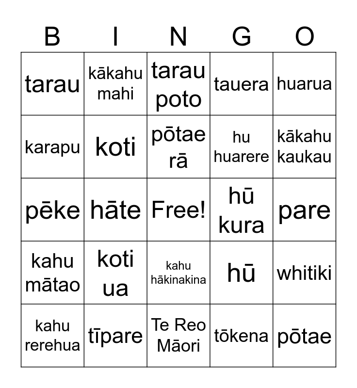 This bingo card has a free space and 31 words: Te Reo Māori, kākahu, hāte, tīhāte, tarau, tarau poto, koti, hū, hū kura, tōkena, pare, pōtae, rāpaki, kākahu moe, kākahu kaukau, rīpene, whitiki, koti ua, kahu mātao, kahu hākinakina, huarua, kākahu kura, kahu rerehua, kākahu mahi, hu huarere, karapu, tauera, pēke, tīpare, pōtae rā and tīrairaka.