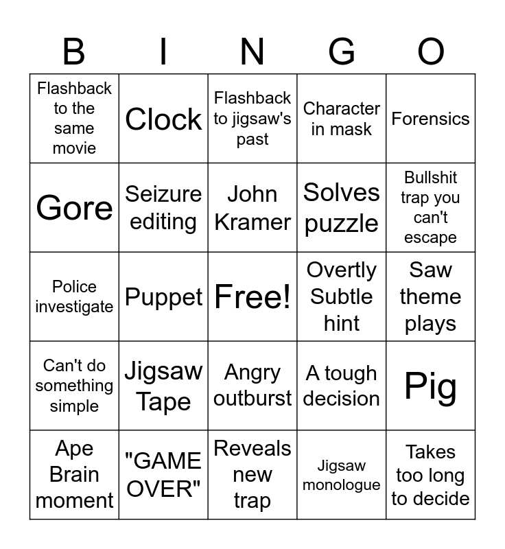 This bingo card has a free space and 29 words: Ape Brain moment, No time to act, Puppet, Flashback to previous movie, Flashback to the same movie, Flashback to jigsaw's past, Seizure editing, Jigsaw Tape, Overtly Subtle hint, "GAME OVER", Saw theme plays, Takes too long to decide, Reveals new trap, Jigsaw monologue, Bullshit trap you can't escape, Screaming, Angry outburst, Can't do something simple, Forensics, Police investigate, A tough decision, A decision that kills, Solves puzzle, Gore, Character in mask, Clock, Pig, John Kramer and Cancer mentioned.