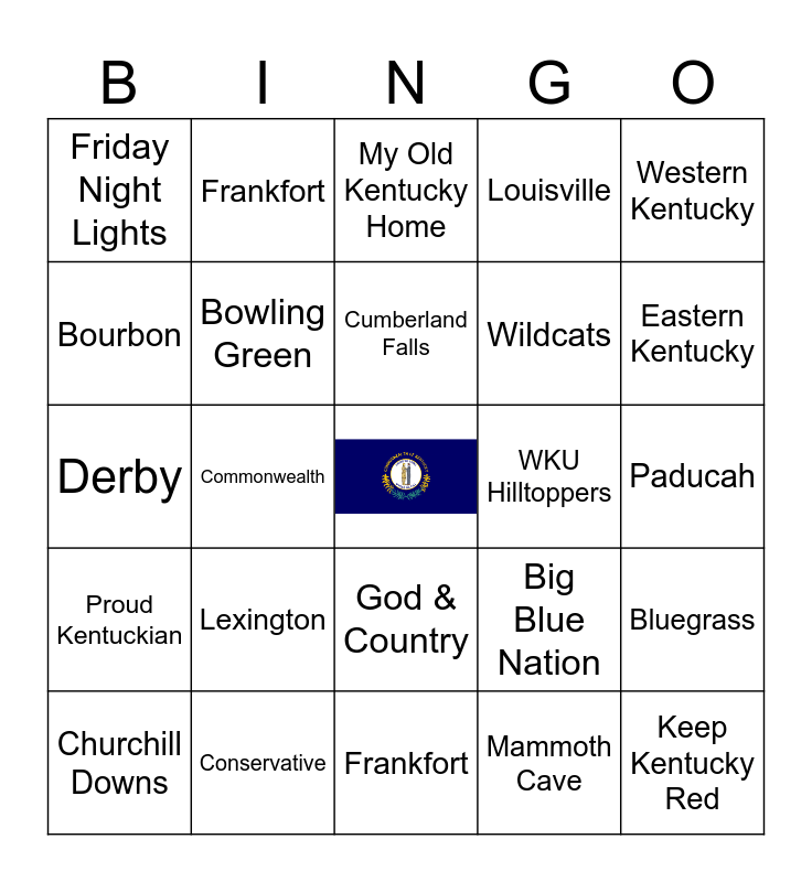 This bingo card has a free space and 24 words: Lexington, Conservative, Cumberland Falls, Churchill Downs, Western Kentucky, Friday Night Lights, Bourbon, Frankfort, WKU Hilltoppers, God & Country, Wildcats, Derby, Big Blue Nation, Bluegrass, Bowling Green, Mammoth Cave, Paducah, My Old Kentucky Home, Eastern Kentucky, Commonwealth, Keep Kentucky Red, Proud Kentuckian, Louisville and Frankfort.