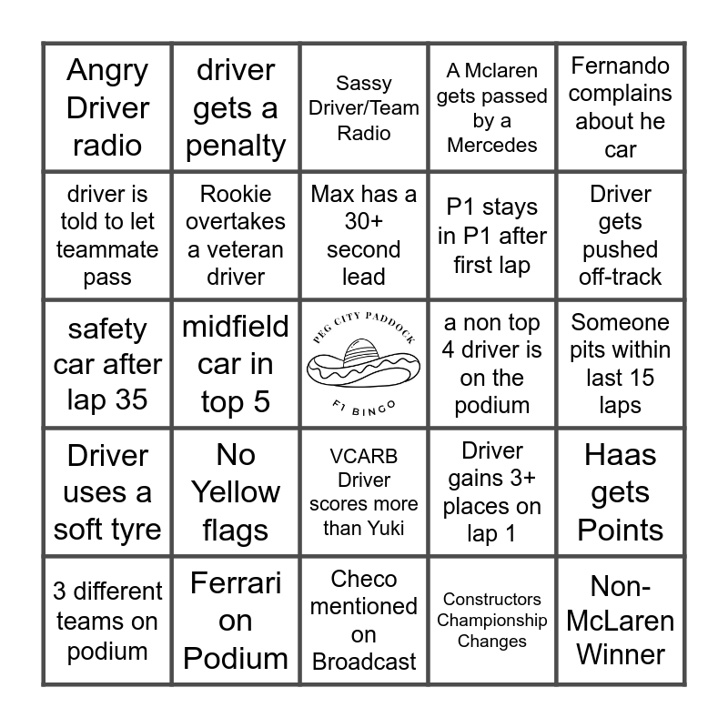 This bingo card has a free space and 24 words: No Yellow flags, Ferrari on Podium, Max has a 30+ second lead, 3 different teams on podium, Fernando complains about he car, Angry Driver radio, driver is told to let teammate pass, driver gets a penalty, a non top 4 driver is on the podium, VCARB Driver scores more than Yuki, P1 stays in P1 after first lap, safety car after lap 35, Driver gains 3+ places on lap 1, Haas gets Points, Rookie overtakes a veteran driver, Constructors Championship Changes, Someone pits within last 15 laps, Sassy Driver/Team Radio, Driver gets pushed off-track, midfield car in top 5, Non-McLaren Winner, Driver uses a soft tyre, A Mclaren gets passed by a Mercedes and Checo mentioned on Broadcast.