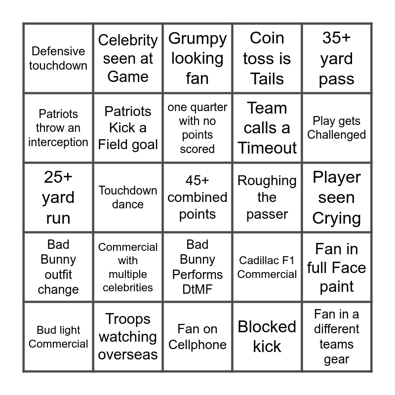 This bingo card has 35 words: Bad Bunny wearing a Straw hat, Seahawks Touchdown in First Quarter, Face masking, Patriots Kick a Field goal, Bad Bunny Performs DtMF, Coin toss is Tails, Patriots throw an interception, Quarterback Sack, one quarter with no points scored, Missed Field goal, 25+ yard run, 35+ yard pass, Fumble, player injury, Defensive touchdown, Roughing the passer, Blocked kick, Touchdown dance, Bad Bunny outfit change, 45+ combined points, Cadillac F1 Commercial, Bud light Commercial, Fan in full Face paint, Troops watching overseas, Grumpy looking fan, Play gets Challenged, Fan in a different teams gear, Commercial with a Dog, Team calls a Timeout, Player seen Crying, Someone kisses the Trophy, Fan on Cellphone, Commercial with multiple celebrities, Celebrity seen at Game and Diving Catch.