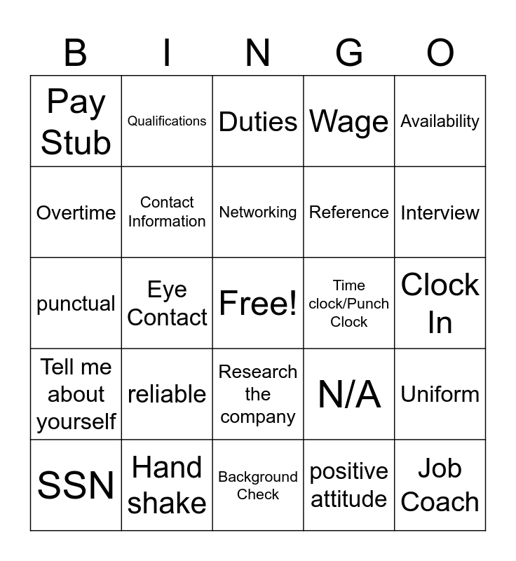 This bingo card has a free space and 39 words: Seasonal, Job posting, Rate of Pay, Contact Information, SSN, Research the company, Networking, Work Ethic, Availability, Tell me about yourself, Eye Contact, Wage, Job Coach, Clock In, Time clock/Punch Clock, reliable, Schedule, Pay Stub, Indeed.com, N/A, Overtime, Background Check, Reference, Interview, Full Time, Employment History, Application, Part Time, Skills, Qualifications, Mock Interview, Benefits, Duties, Hand shake, positive attitude, Dress Code, Uniform, punctual and Resume.