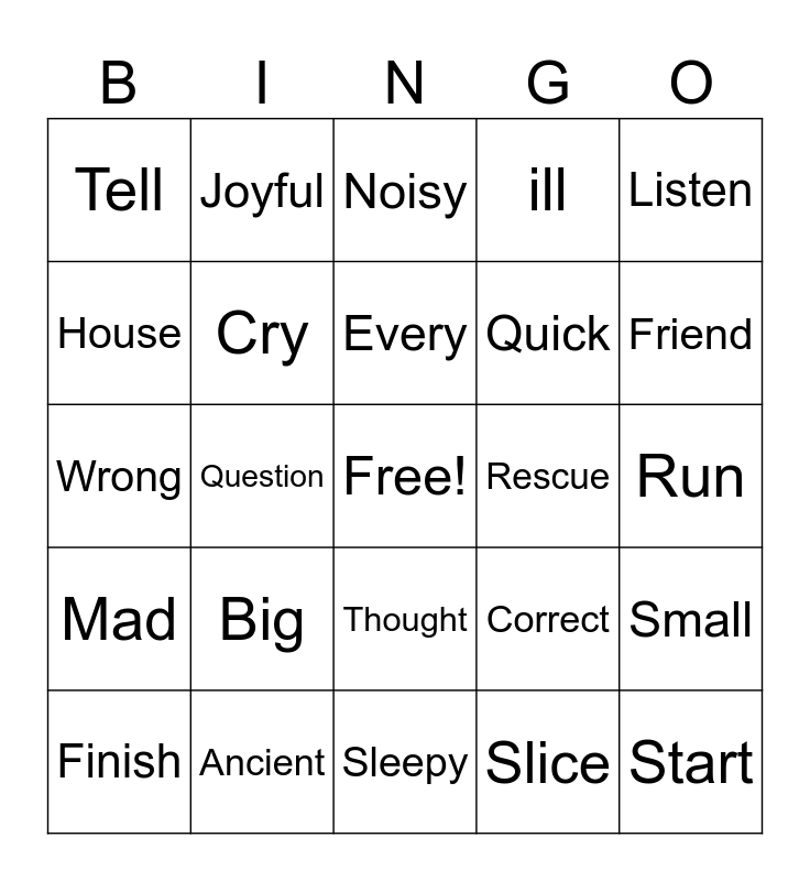 This bingo card has a free space and 24 words: Big, Ancient, Every, Finish, Listen, Tell, House, Joyful, Rescue, Thought, Quick, Wrong, Correct, Small, Cry, Slice, Run, Noisy, Friend, Question, Start, Mad, ill and Sleepy.