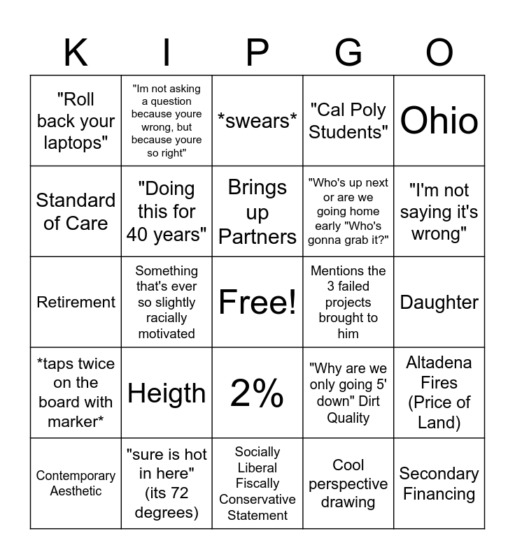 This bingo card has a free space and 24 words: Heigth, "sure is hot in here" (its 72 degrees), Brings up Partners, Contemporary Aesthetic, Ohio, "Roll back your laptops", Standard of Care, "Im not asking a question because youre wrong, but because youre so right", Mentions the 3 failed projects brought to him, 2%, "Who's up next or are we going home early "Who's gonna grab it?", Retirement, "Why are we only going 5' down" Dirt Quality, Altadena Fires (Price of Land), "Doing this for 40 years", Cool perspective drawing, Daughter, *swears*, "I'm not saying it's wrong", Something that's ever so slightly racially motivated, Secondary Financing, *taps twice on the board with marker*, "Cal Poly Students" and Socially Liberal Fiscally Conservative Statement.