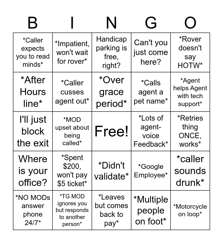 This bingo card has a free space and 24 words: *Spent $200, won't pay $5 ticket*, *TG MOD ignores you but responds to another person*, *Over grace period*, *NO MODs answer phone 24/7*, *Rover doesn't say HOTW*, *Caller expects you to read minds*, *After Hours line*, *Impatient, won't wait for rover*, *Lots of agent-voice Feedback*, *Didn't validate*, *Calls agent a pet name*, I'll just block the exit, *Google Employee*, *caller sounds drunk*, *Caller cusses agent out*, *Multiple people on foot*, *Retries thing ONCE, works*, Handicap parking is free, right?, *Agent helps Agent with tech support*, *MOD upset about being called*, *Motorcycle on loop*, Where is your office?, Can't you just come here? and *Leaves but comes back to pay*.