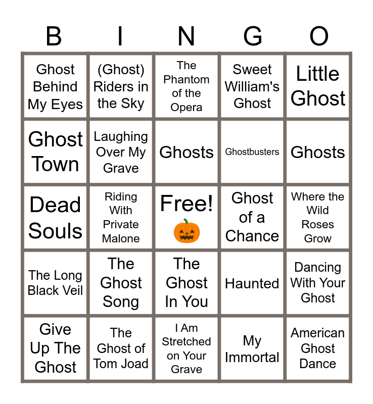 This bingo card has a free space and 24 words: The Ghost Song, The Ghost of Tom Joad, Ghosts, Give Up The Ghost, Little Ghost, Ghost Behind My Eyes, Ghost Town, (Ghost) Riders in the Sky, Ghost of a Chance, The Ghost In You, Ghostbusters, Dead Souls, Haunted, Dancing With Your Ghost, Laughing Over My Grave, My Immortal, Where the Wild Roses Grow, The Phantom of the Opera, Ghosts, Riding With Private Malone, American Ghost Dance, The Long Black Veil, Sweet William's Ghost and I Am Stretched on Your Grave.