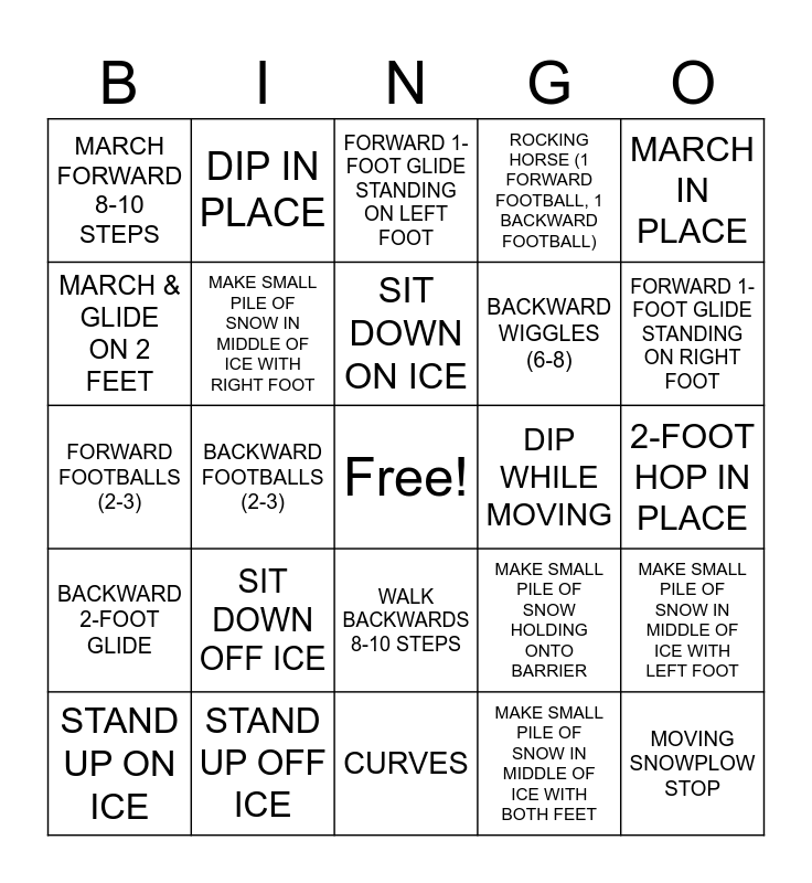 This bingo card has a free space and 24 words: SIT DOWN OFF ICE, STAND UP OFF ICE, SIT DOWN ON ICE, STAND UP ON ICE, MARCH IN PLACE, MARCH FORWARD 8-10 STEPS, MARCH & GLIDE ON 2 FEET, DIP IN PLACE, DIP WHILE MOVING, WALK BACKWARDS 8-10 STEPS, BACKWARD WIGGLES (6-8), FORWARD FOOTBALLS (2-3), MAKE SMALL PILE OF SNOW HOLDING ONTO BARRIER, MAKE SMALL PILE OF SNOW IN MIDDLE OF ICE WITH LEFT FOOT, MAKE SMALL PILE OF SNOW IN MIDDLE OF ICE WITH RIGHT FOOT, MAKE SMALL PILE OF SNOW IN MIDDLE OF ICE WITH BOTH FEET, 2-FOOT HOP IN PLACE, FORWARD 1-FOOT GLIDE STANDING ON LEFT FOOT, FORWARD 1-FOOT GLIDE STANDING ON RIGHT FOOT, BACKWARD FOOTBALLS (2-3), MOVING SNOWPLOW STOP, BACKWARD 2-FOOT GLIDE, ROCKING HORSE (1 FORWARD FOOTBALL, 1 BACKWARD FOOTBALL) and CURVES.