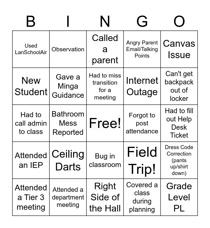 This bingo card has a free space and 59 words: Attended a Staff Meeting, Attended a department meeting, Attended a 504, Attended an IEP, Covered a class during planning, Had to eat in your classroom, Gave a Minga Guidance, Gave a Minga Praise, Internet Outage, Broken Copier, Angry Parent Email/Talking Points, Alternative Schedule, New Student, Sent Raven Review, Sent Talking Points Reminder, Used LanSchoolAir, Grade Level PL, Canvas Issue, Got yelled at by Marsh for your door, Had to miss transition for a meeting, Forgot to post attendance, Called a parent, Attended a Tier 3 meeting, Dress Code Correction (pants up/shirt down), Student forgot locker combination, Unexpected Tutoring Session, Random Former Student Showed Up, Took up a cell phone, Can't get backpack out of locker, Didn't have time to potty, Also, too, Drill, Got yelled at by Marsh for the crosswalk, Locker is stuck, Observation, Is this a grade?, Student Sleeping, Bathroom Mess Reported, Student called to office NOT to leave, Had to call admin to class, Fight, Ceiling Darts, Had to fill out Help Desk Ticket, Locked yourself out of your classroom, 6 7, Student farted, Accidentally Pushed Call Button, Recordex Stopped Working, Bug in classroom, Right Side of the Hall, Been called/told "Bruh", Student requested schedule change, Student Counselor Request, Student asks to see Admin, Can we have a party?, Field Trip!, Student asks, "When's break?", Do we have to do work? and Planning a Thanksgiving Vacation.